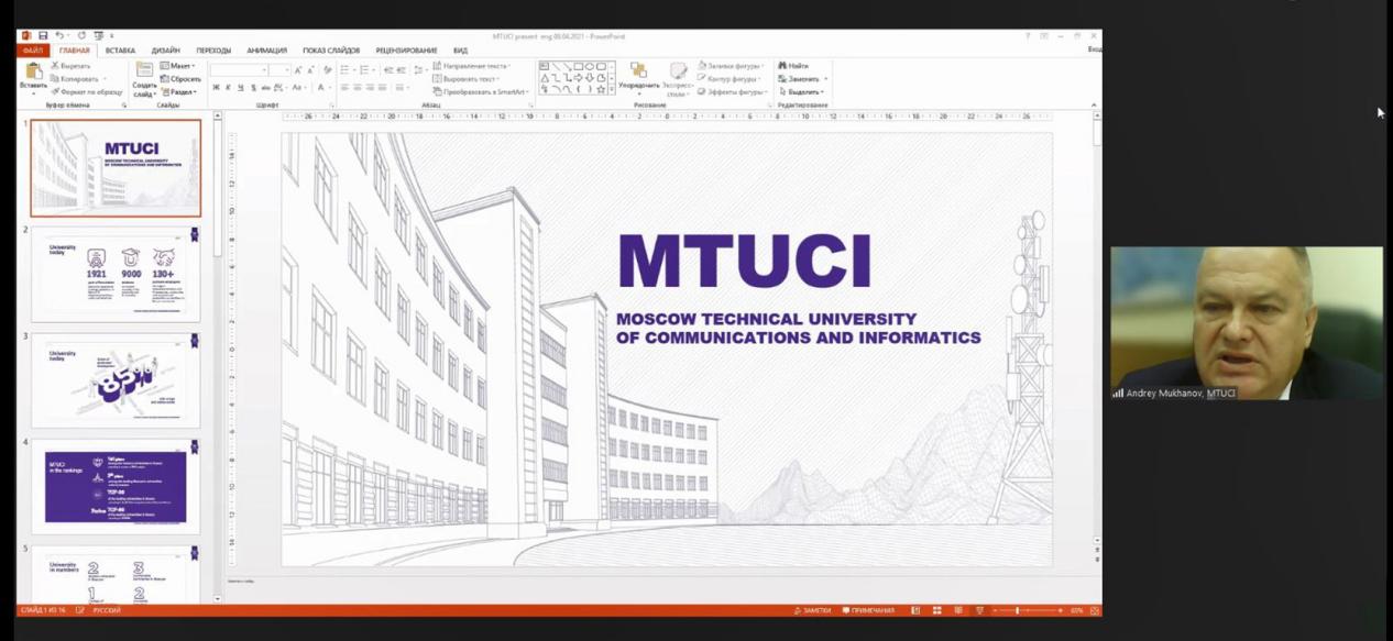安德烈 穆汉诺夫 尤里耶维奇会上致辞,他首先对中国一直以来对俄罗斯的帮助和支持表示感谢,并表示该校一直以来重视国际化办学,十分珍视与中国院校的交流合作。他介绍了莫斯科国立通讯与信息技术大学的基本情况,学校办学历史悠久,综合实力、电气类专业实力以及就业率等指标在俄罗斯均名列前茅,与中国华为共建培训中心,开展较为紧密的交流合作。他表示该校十分重视与我院的交流合作,并期待疫情过去之后实现线下沟通,共同推动中外合作办学项目持续高质量发展。
